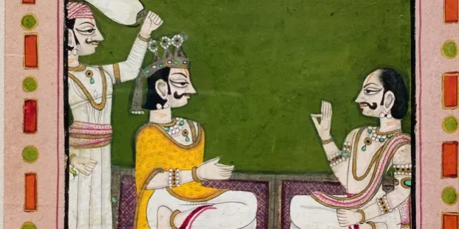 KING-IN-CONVERSATION-WITH-PRIEST-KISHENGARH-1820-TO1850-OPAQUE-WATER-COLOUR-WITH-GOLD-ON-WASLI-17X12-CMS